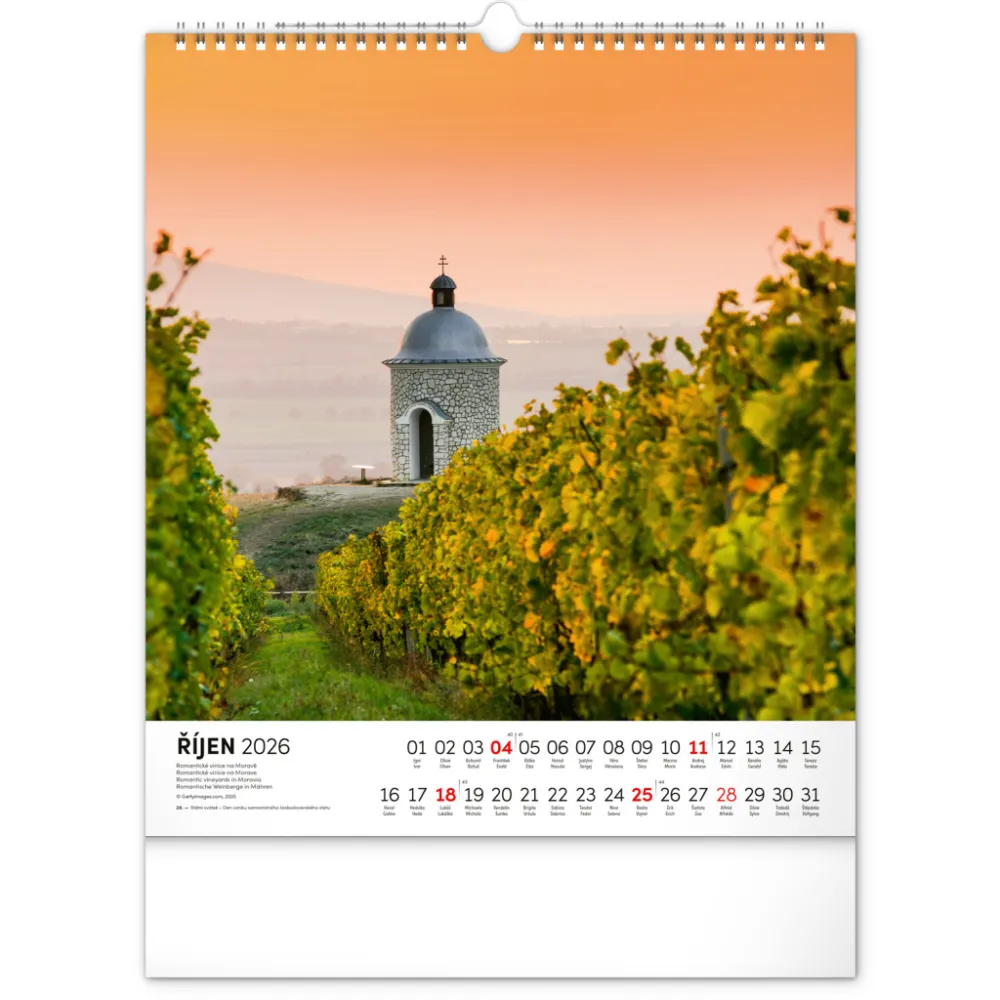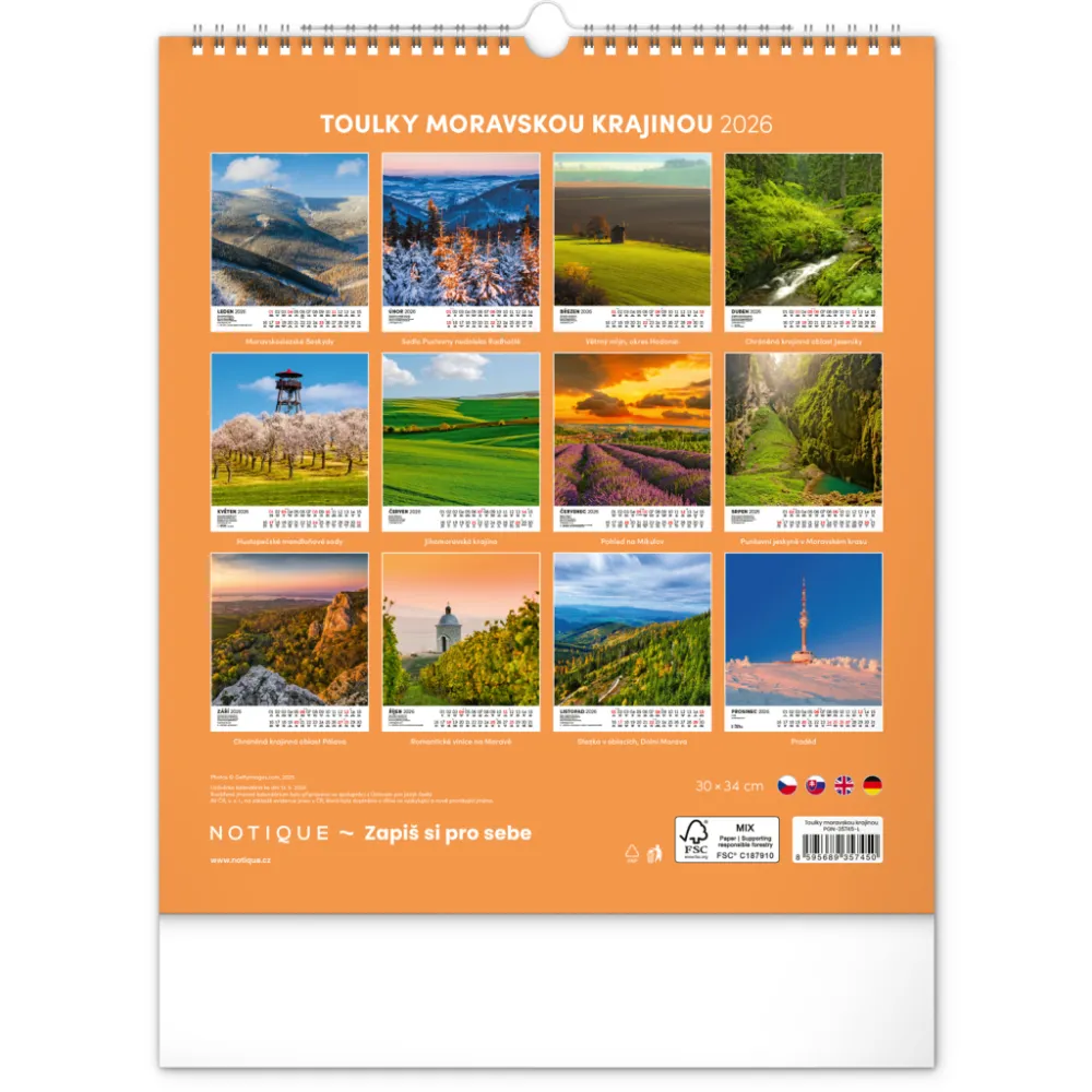 NOTIQUE Nástěnný kalendář Toulky moravskou krajinou 2026, 30 x 34 cm. Nástěnný kalendář oslavuje krásy Moravy v celé její rozmanitosti. Uvnitř najdete dvanáct působivých fotografií moravské krajiny, doplněných českým kalendáriem s českými jmény. Praktický formát vhodný do každého interiéru.