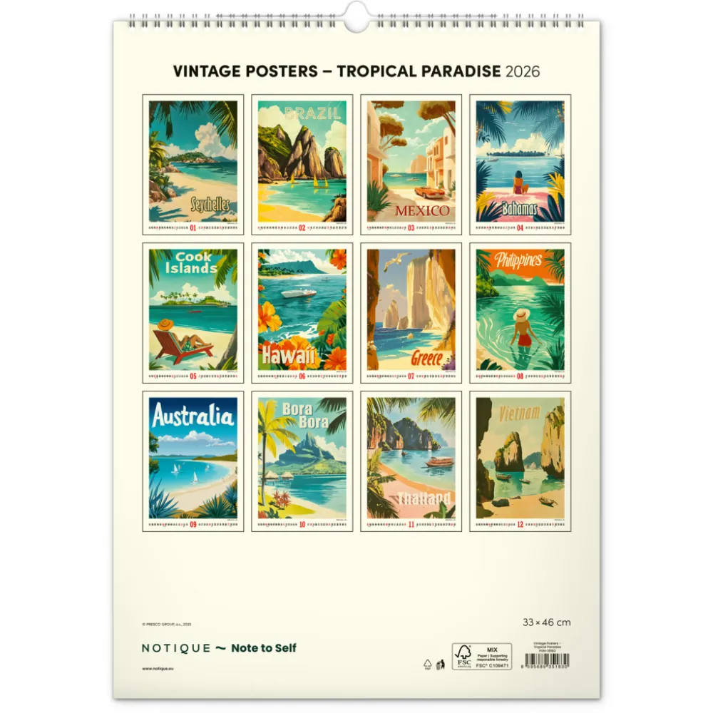 Detailní popis: NOTIQUE Nástěnný kalendář Vintage plakáty – tropické ráje 2026, 33 x 46 cm