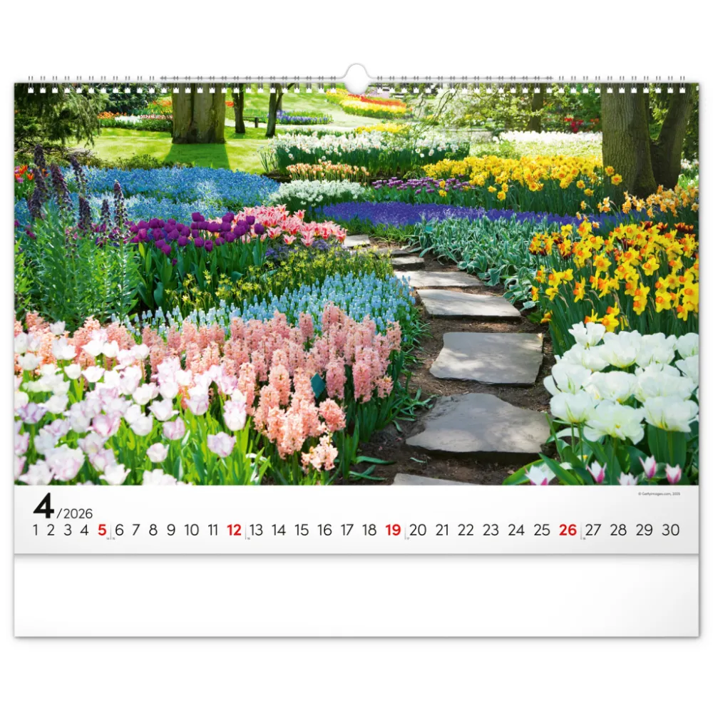 Dvanáct snímků zachycujících pomíjivou krásu květin v zahradách. Vy si však budete pohledu na nádherné barevné zahrady užívat po celý rok. Zahrady, oázy klidu a relaxace v nástěnném kalendáři doplňuje univerzální kalendárium se zvýrazněnými nedělemi na černém pozadí.