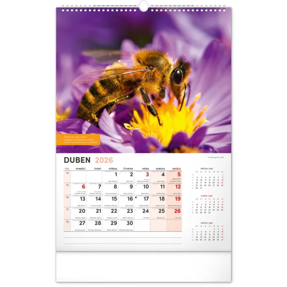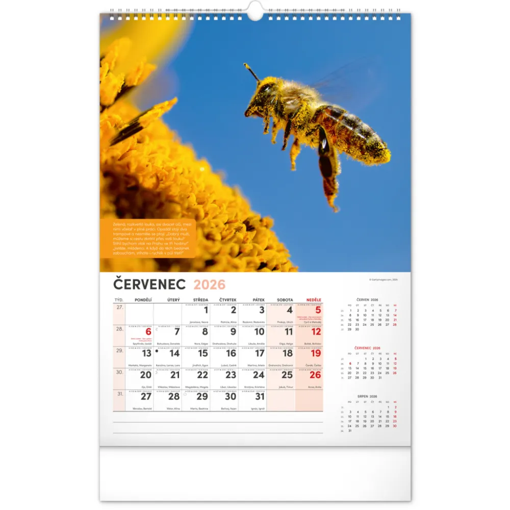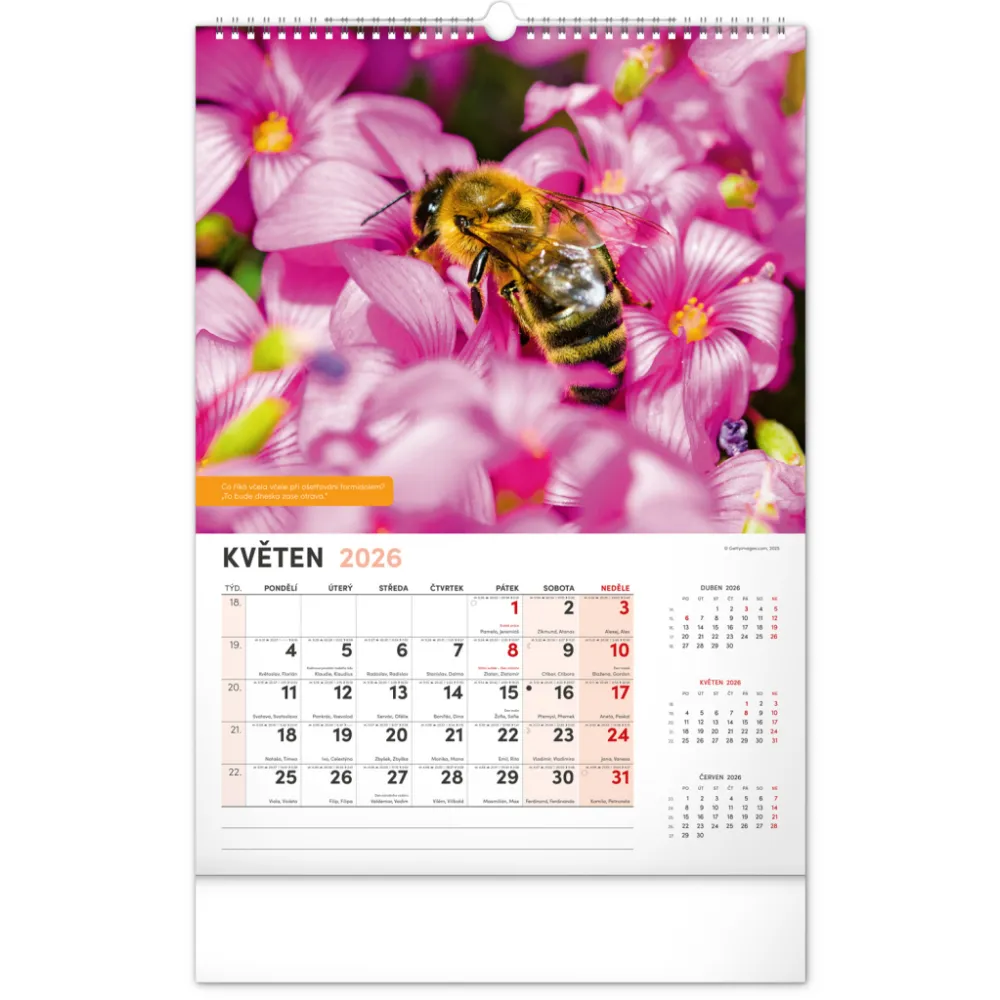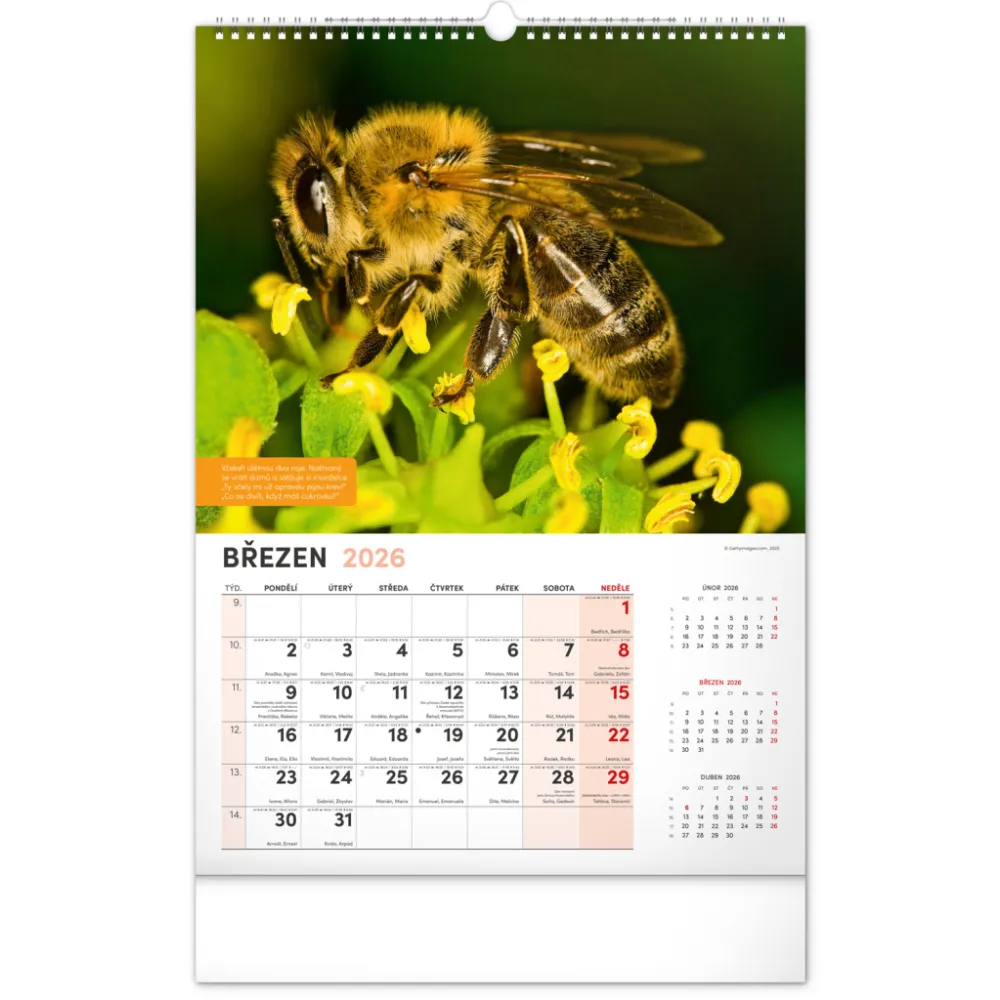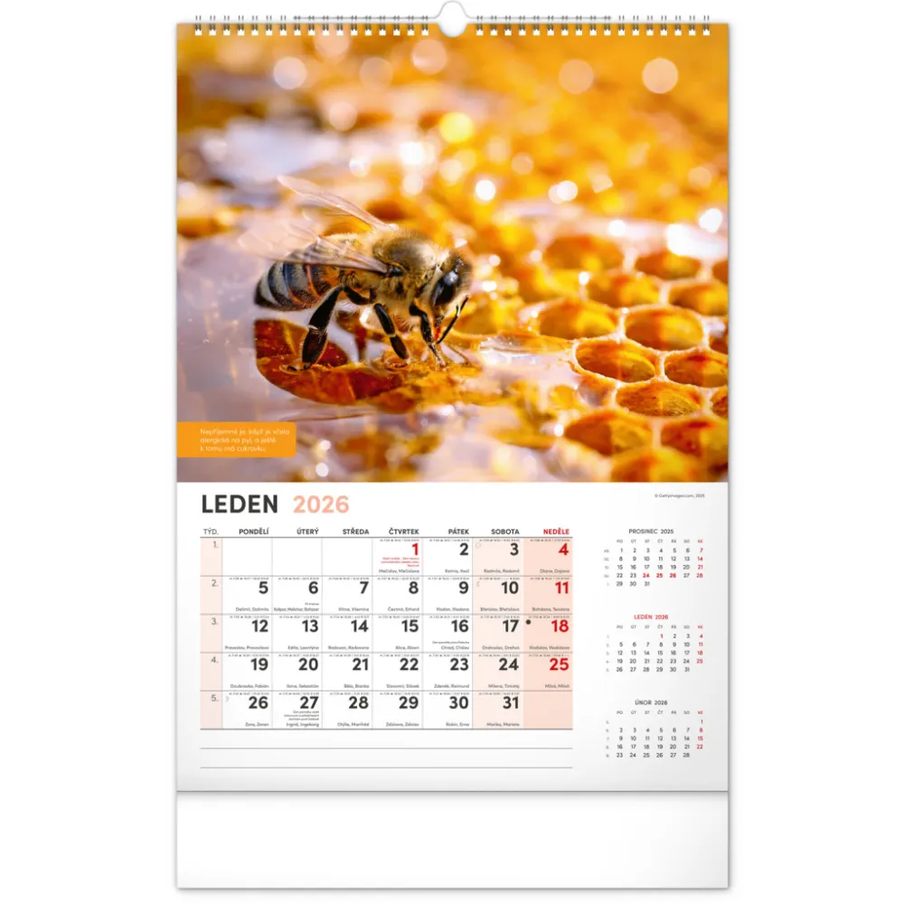 NOTIQUE Nástěnný Včelařský kalendář 2026, 33 x 46 cm. Nástěnný kalendář pro všechny začínající i pokročilé včelaře. Fotografie každý měsíc doplňují pranostiky, včelařská moudra a co by měl v daný měsíc včelař udělat. Kalendář obsahuje české kalendárium se jmény a svátky, také památné dny a východy a ...