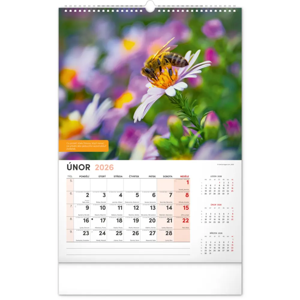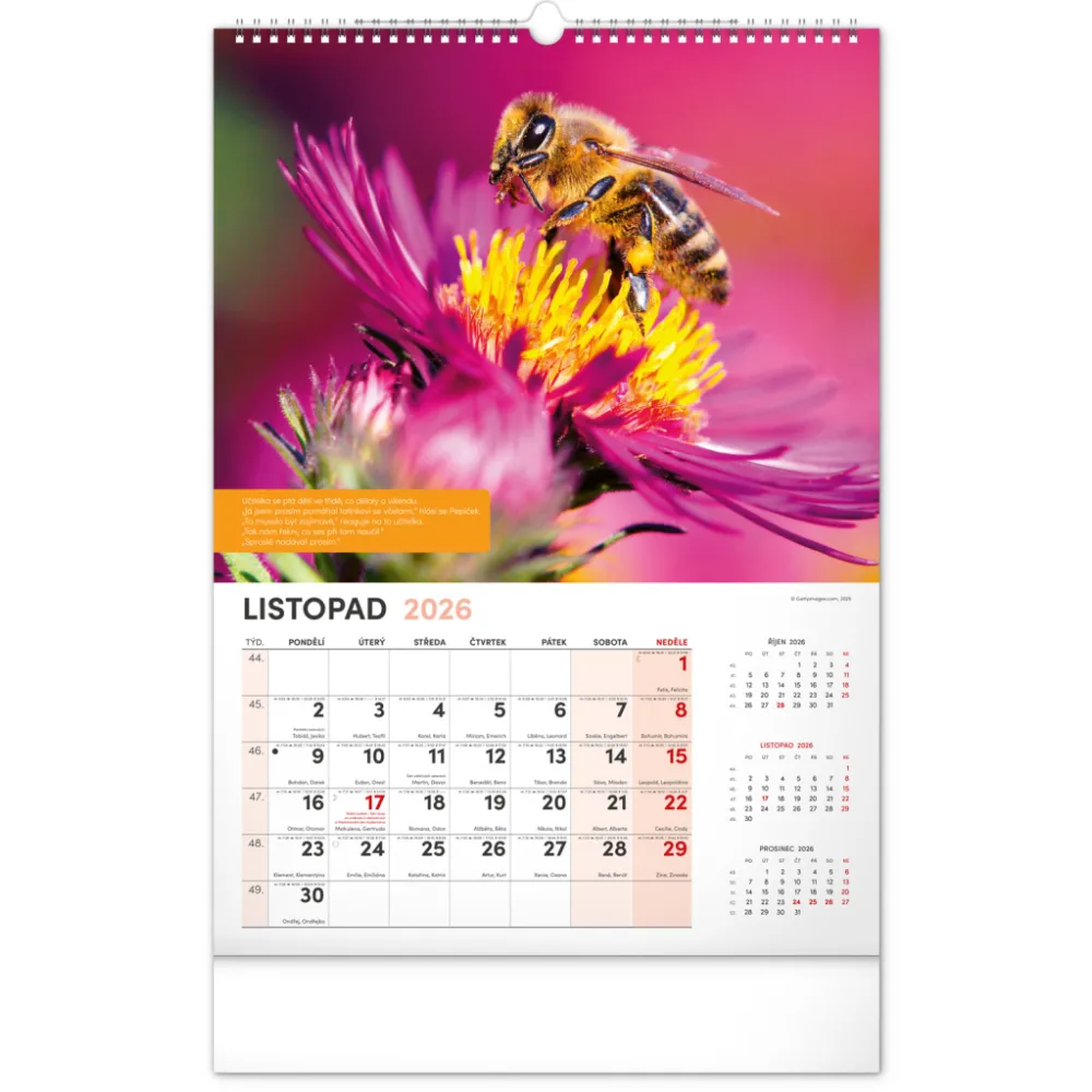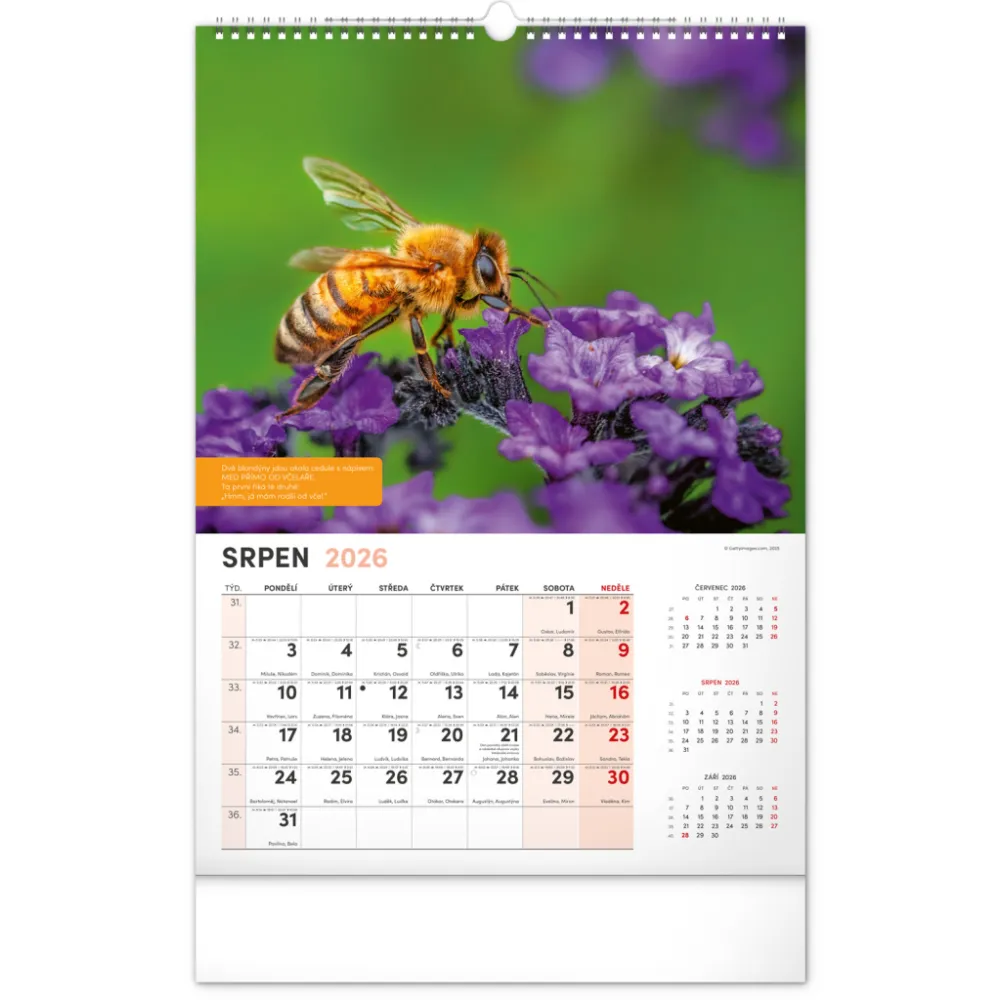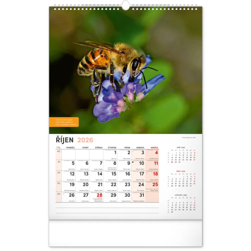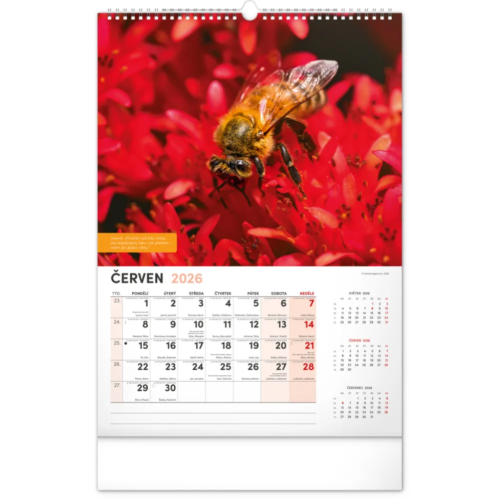 NOTIQUE Nástěnný Včelařský kalendář 2026, 33 x 46 cm. Nástěnný kalendář pro všechny začínající i pokročilé včelaře. Fotografie každý měsíc doplňují pranostiky, včelařská moudra a co by měl v daný měsíc včelař udělat. Kalendář obsahuje české kalendárium se jmény a svátky, také památné dny a východy a ...