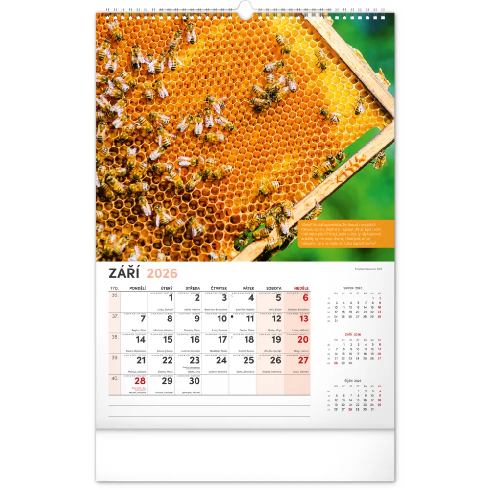 Nástěnný kalendář pro všechny začínající i pokročilé včelaře. Fotografie každý měsíc doplňují pranostiky, včelařská moudra a co by měl v daný měsíc včelař udělat. Kalendář obsahuje české kalendárium se jmény a svátky, také památné dny a východy a západy slunce. S naším kalendářem se budete hned pustit do včelaření!