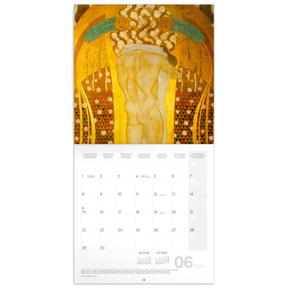 Obrazy populárního secesního malíře Gustava Klimta na stránkách poznámkového kalendáře. Ten obsahuje přehledné kalendárium od září 2025 do prosince 2026 v šesti jazycích, měsíční fáze, důležité svátky a prostor pro poznámky na každý den.