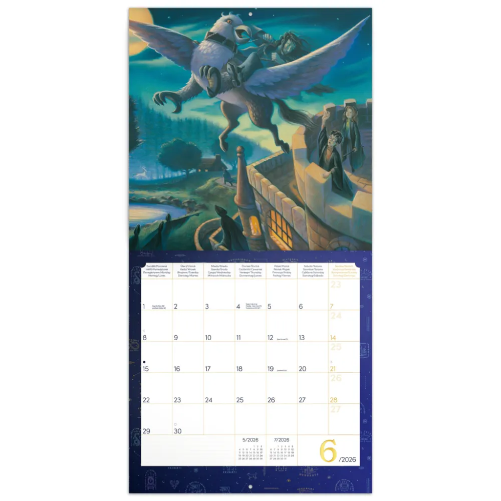 Poznámkový kalendář s dvanácti fotografiemi oblíbených hrdinů z kouzelnického světa obsahuje také přehled čtyř posledních měsíců roku 2025 a osmijazyčné kalendárium na rok 2026 s mezinárodními svátky.