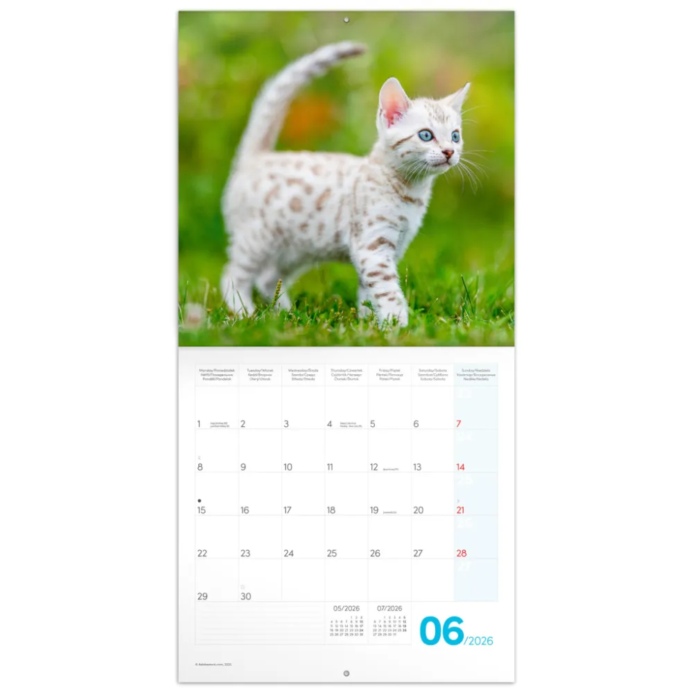Poznámkový kalendář s hravými a roztomilými koťaty, se kterými byste se nejraději pomazlili. Uvnitř najdete přehledné kalendárium od září 2025 do prosince 2026 v šesti jazycích, měsíční fáze, důležité svátky a prostor pro poznámky na každý den.