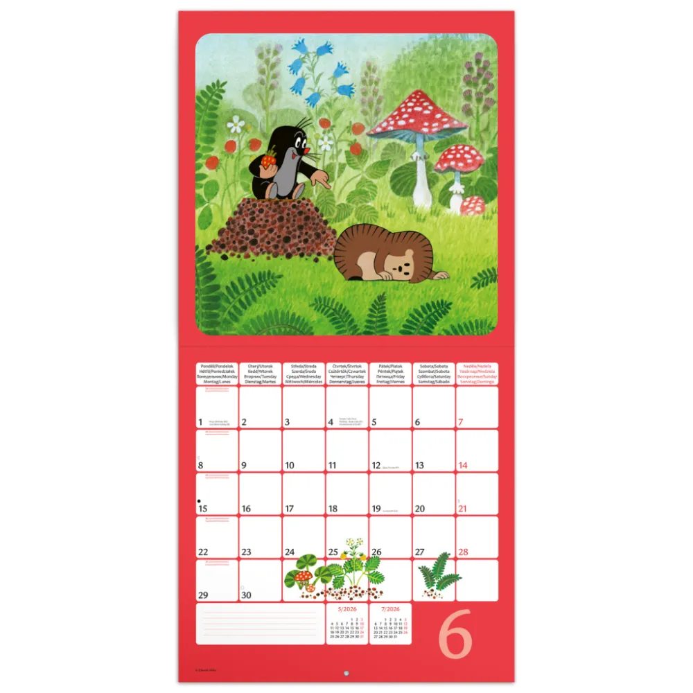 Krteček – postava mnoha kreslených příběhů Zdeňka Milera, které obletěly celý svět. Poznámkový kalendář s ilustracemi z pohádek doplňuje přehledné kalendárium od září 2025 do prosince 2026 v osmi jazycích, měsíční fáze, důležité svátky a prostor pro poznámky na každý den.