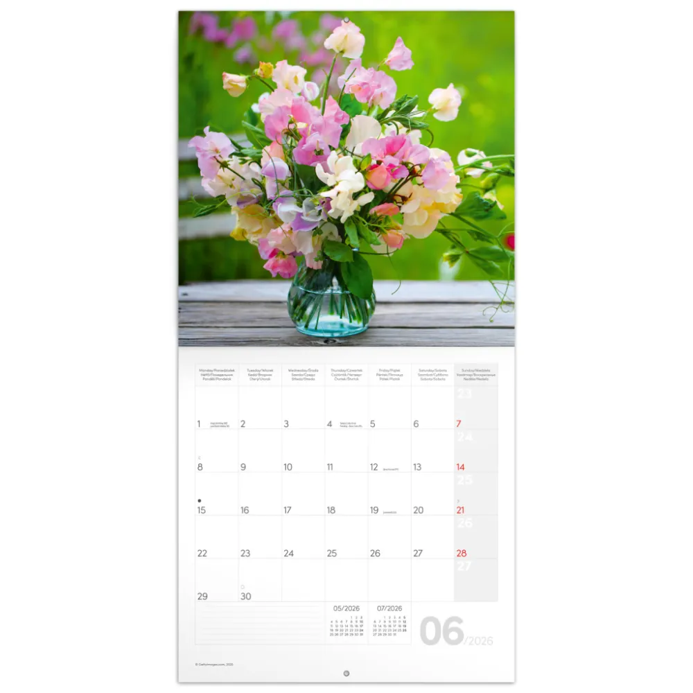 Dopřejte si krásu čerstvých květin, které nikdy neopadají, na fotografiích v poznámkovém kalendáři. V kalendáři kromě fotek najdete přehledné kalendárium od září 2025 do prosince 2026 v šesti jazycích, měsíční fáze, důležité svátky a prostor pro poznámky na každý den.