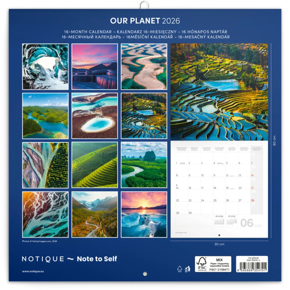 NOTIQUE Poznámkový kalendář Naše Planeta 2026, 30 x 30 cm. Dvanáct překrásných krajinných fotografií z různých koutů světa. Kalendář obsahuje přehledné kalendárium od září 2025 do prosince 2026v šesti jazycích, měsíční fáze, důležité svátky a prostor pro poznámky na každý den.