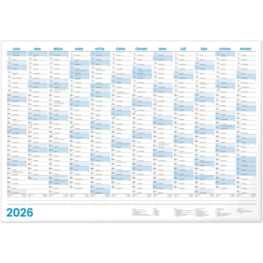 NOTIQUE Roční kalendář 2026, B1, 96,4 x 67 cm. Praktický roční kalendář pro rychlé zaznamenání a vyhledání poznámky. Obsahuje kalendárium s českými jmény a světovými svátky na bílém pozadí.