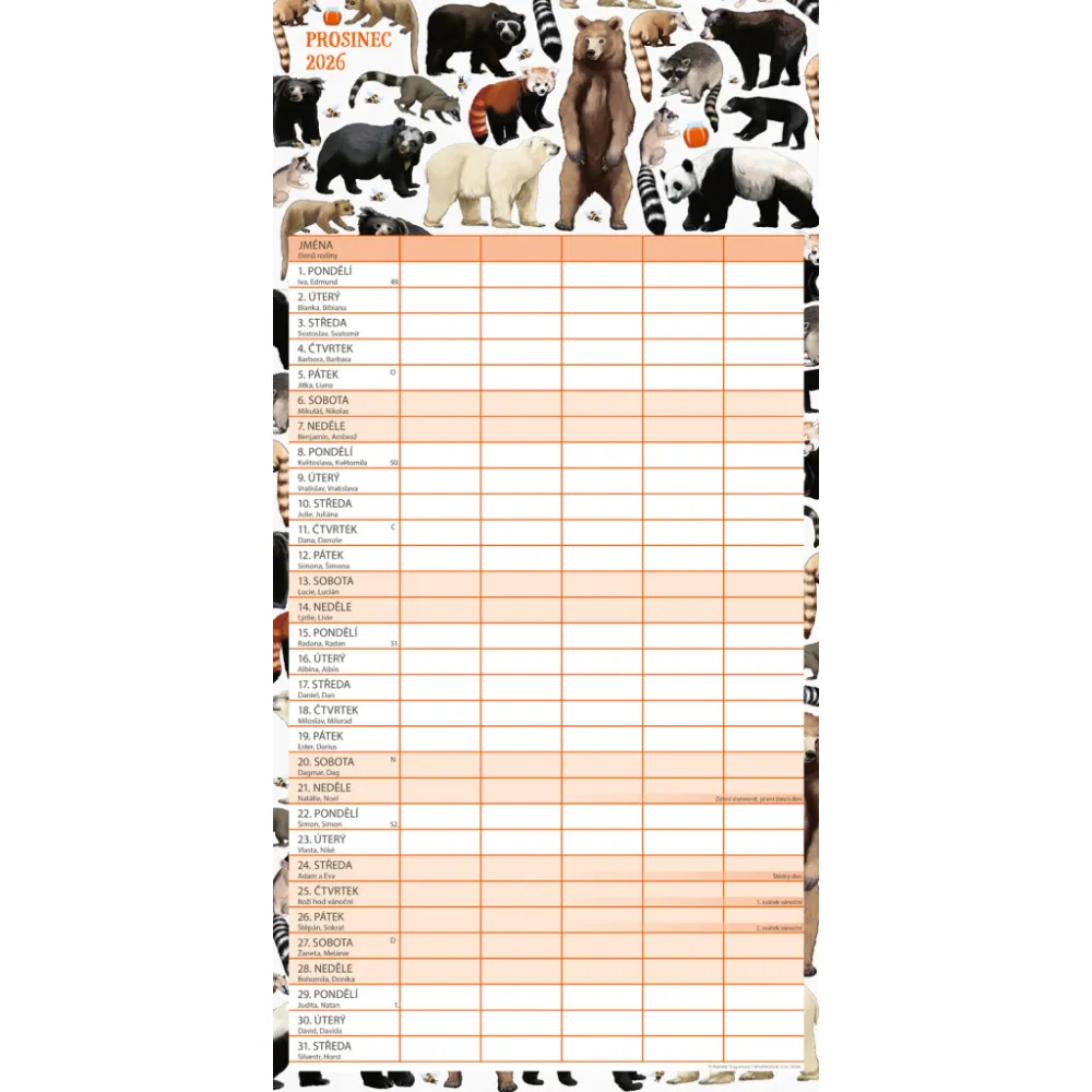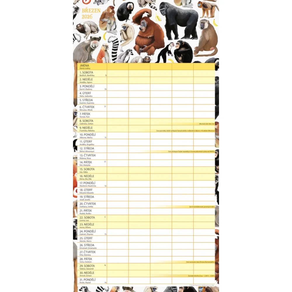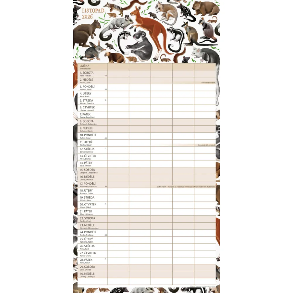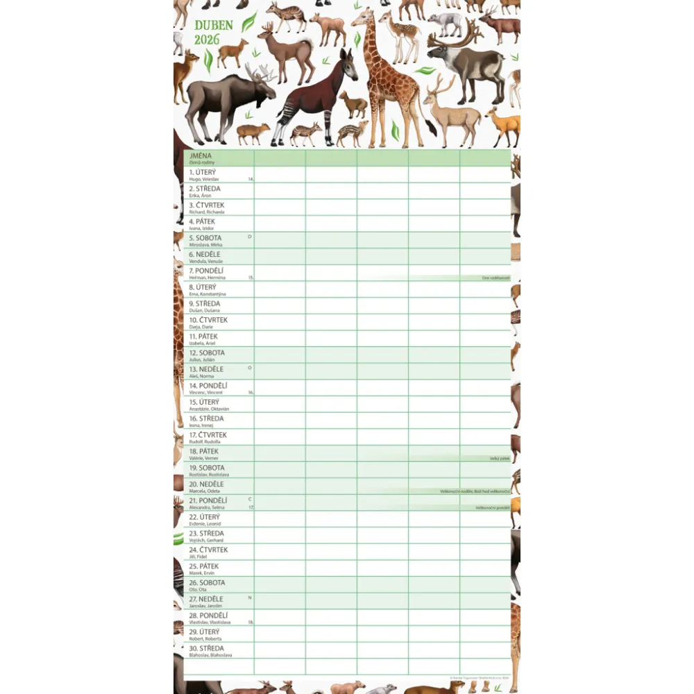 České kalendárium a samostatný plánovač aktivit až pro pět členů domácnosti doplňují krásné ilustrace zvířat. Nechybí státní svátky ani měsíční fáze.
