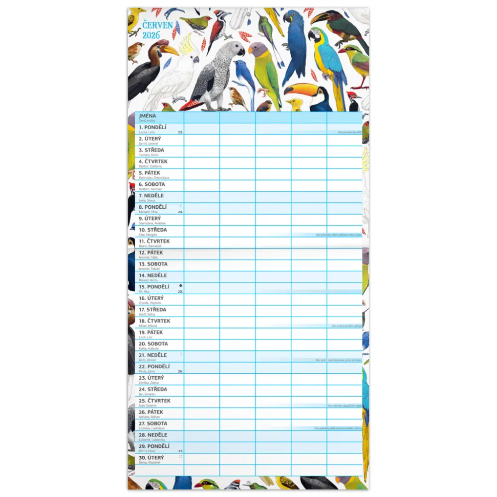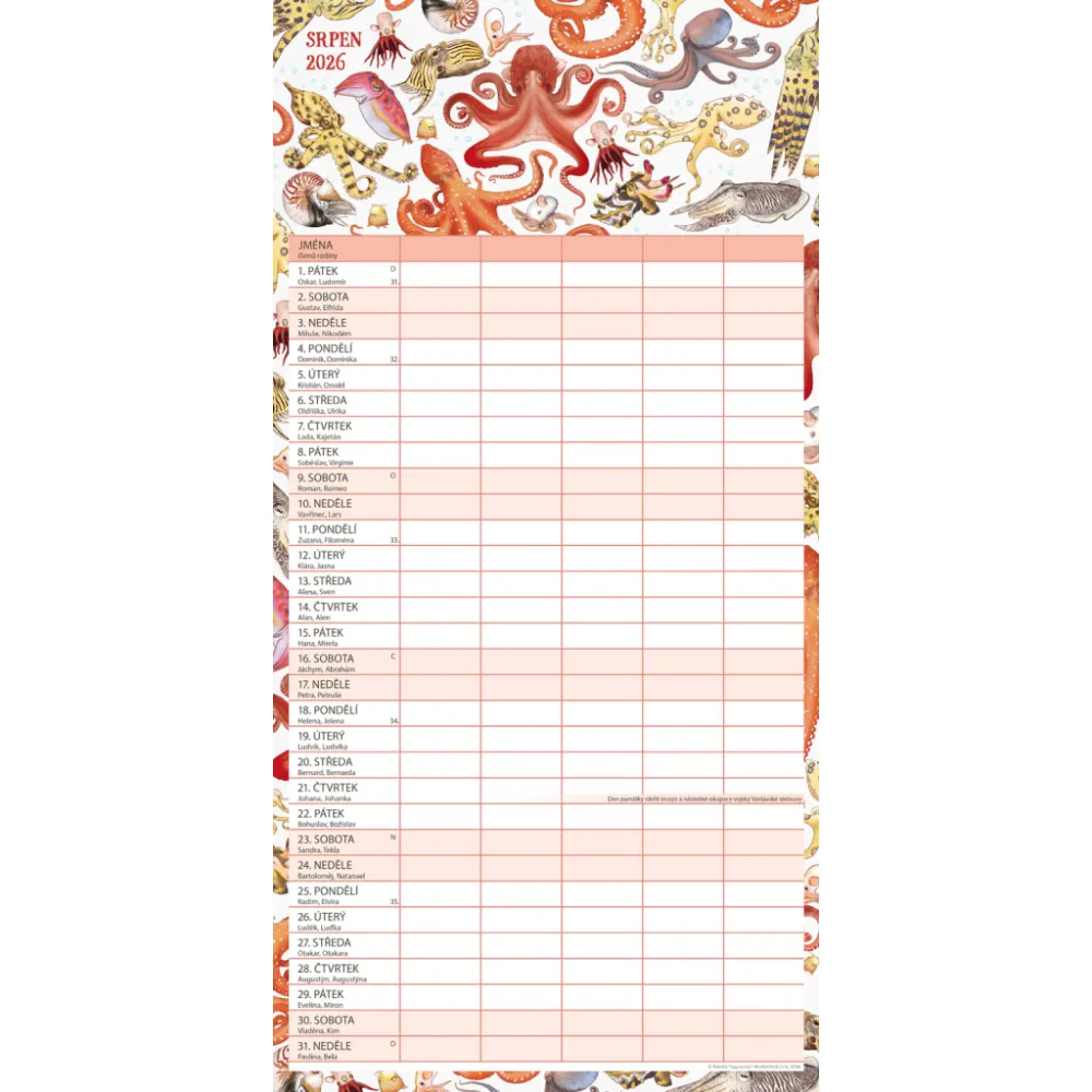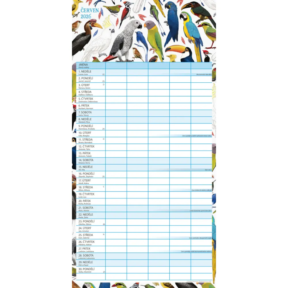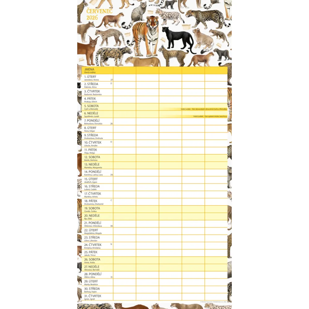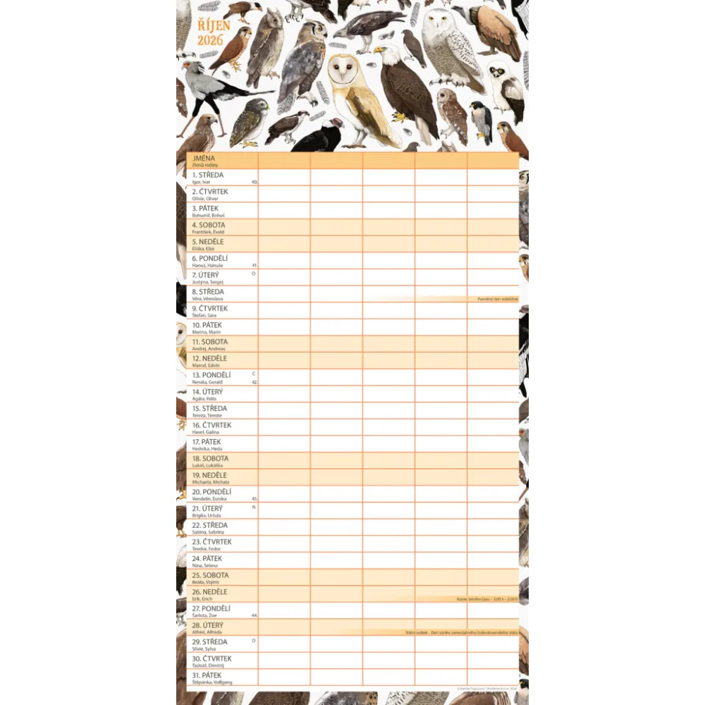 České kalendárium a samostatný plánovač aktivit až pro pět členů domácnosti doplňují krásné ilustrace zvířat. Nechybí státní svátky ani měsíční fáze.