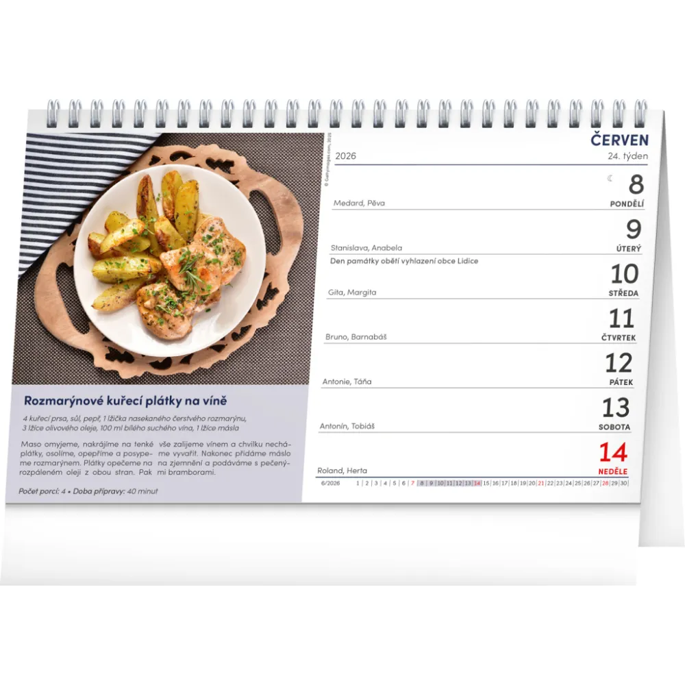 Pro všechny, kteří hledají inspiraci při vymýšlení nových jídel, je tu stolní kalendář nabitý těmi nejzajímavější recepty. Najdete zde 53 receptů, jejichž základem je poctivá domácí kuchyně, kterou vyznávaly už naše babičky. Týdenní stolní kalendář s českými jmény obsahuje také svátky, památné dny, měsíční fáze a přehled na celý rok 2026 a 2027.