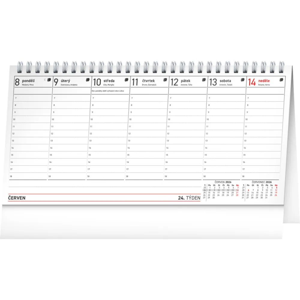 Zapište si do stolního kalendáře se sloupcovým kalendáriem své plány, schůzky a důležitá data. Dostatek místa na poznámky v jednotlivých dnech a přehlednost struktury kalendária doplňují česká jména, svátky a památné dny.