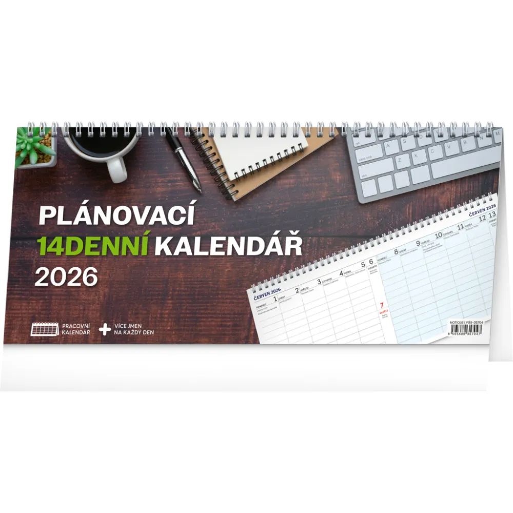 Ve 14-denním stolním kalendáři je mnoho prostoru pro poznámky, dále české kalendárium, svátky a památné dny i měsíční fáze. To vše v přehledném dvoutýdenním rozvržení.