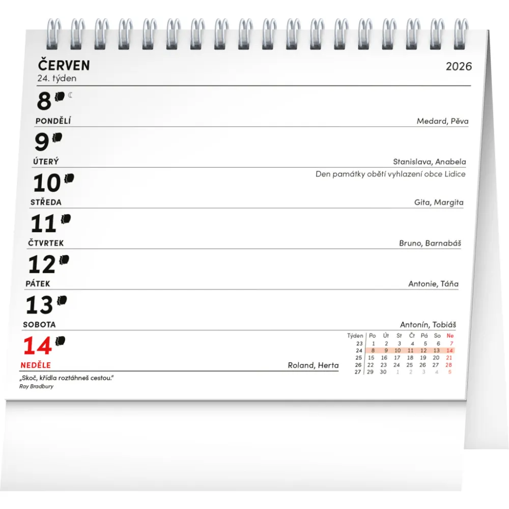 NOTIQUE Stolní kalendář Praktický kalendář s citáty 2026, 16,5 x 13 cm. Praktický stolní kalendář v malém formátu obsahuje přehledné týdenní bezobrázkové kalendárium s dostatečným prostorem pro vaše poznámky. Dále v něm najdete citáty na každý týden, znamení zvěrokruhu, česká jména, svátky a památné dny.