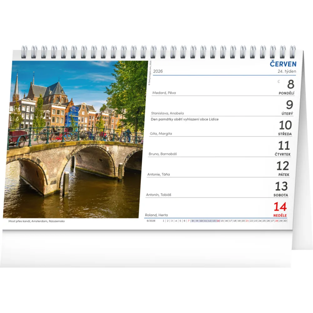 Praktický stolní kalendář s 53 fotografiemi těch nejkrásnějších a nejzajímavějších koutů celého světa. Procestujte svět křížem krážem a podívejte se na místa, která běžně nespatříte. Navštivte světové metropole i zapadlé vesničky, aniž byste museli utrácet za dovolenou. Stolní kalendář s českým kalendáriem obsahuje svátky a památné dny, měsíční fáze a přehled na celý rok 2026 a 2027.