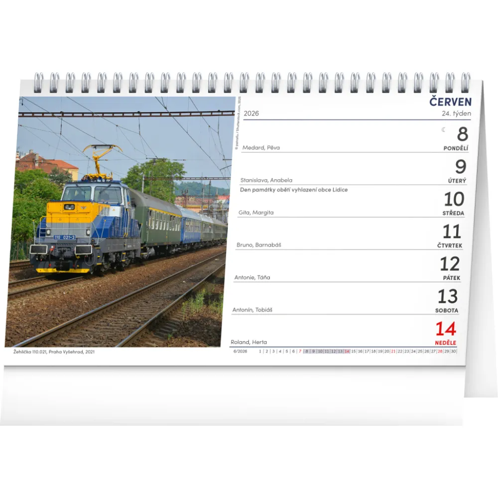 Jezdíte rádi vlakem, máte svou sbírku vláčků, nebo jste alespoň obdivovateli jejich krásy? Možná vám však chybí stolní kalendář s fotografiemi vlaků a železnice. České týdenní kalendárium s prostorem pro vaše poznámky obsahuje jména, svátky a další významné dny.