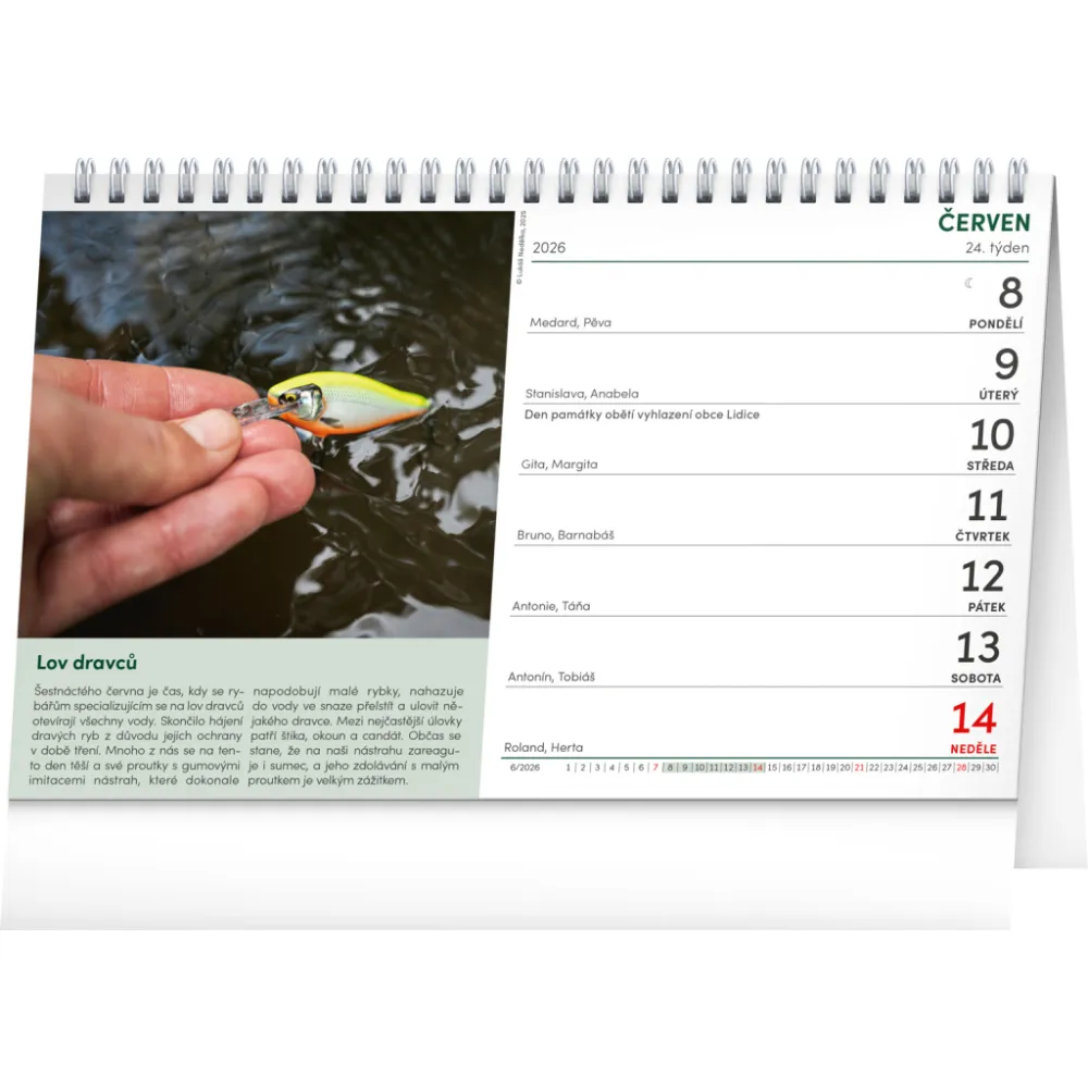 Zajímají vás nejnovější trendy ze světa rybářského sportu? Pak jistě oceníte náš stolní rybářský kalendář. Dozvíte se o rybách i výbavě, kterou by měl každý rybář mít a znát, i tom, jak vypadá život člověka, který rybařinou doslova žije. Kalendář doplňuje české týdenní kalendárium se jmény, svátky a památnými dny, fázemi měsíce a rozšířený seznam jmen.