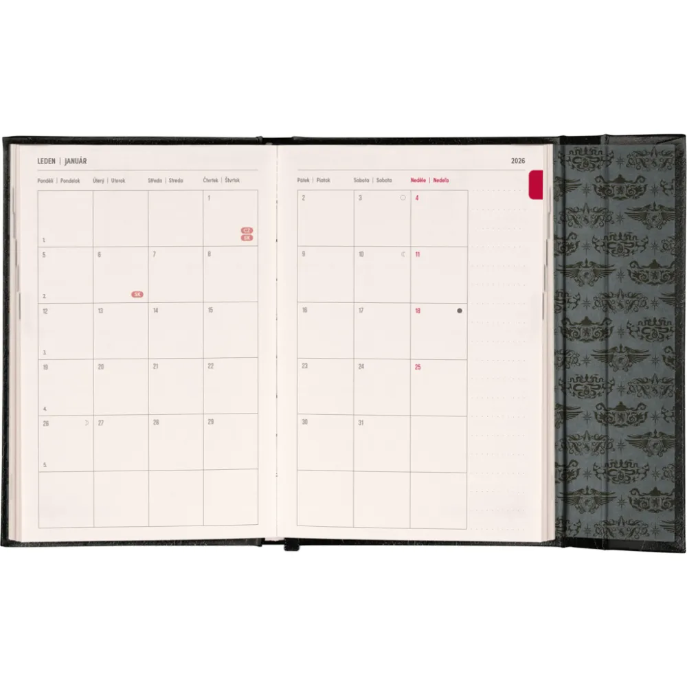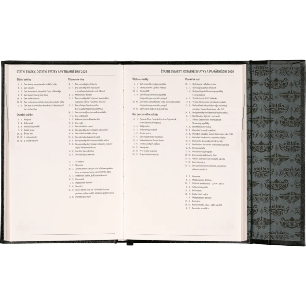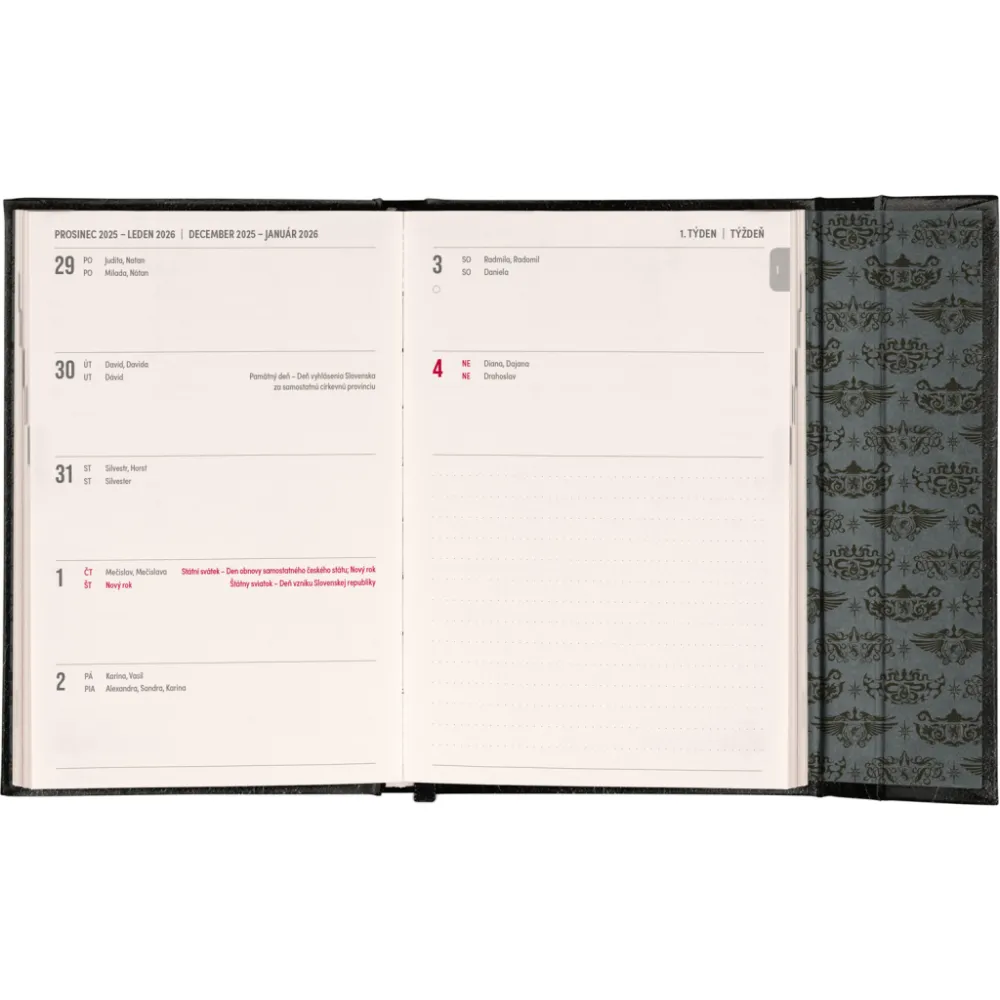 Týdenní diář s praktickým magnetickým uzavíráním je ideální volbou pro ty, kteří chtějí mít své plány přehledně pod kontrolou. Horizontální rozložení s českým a slovenským kalendáriem ve verzi týden na dvou stranách s prostorem pro poznámky. Součástí jsou praktické měsíční přehledy, ideální pro plánování dovolených či prázdnin, a také seznam českých a slovenských svátků a jmenin.