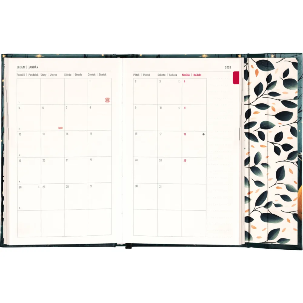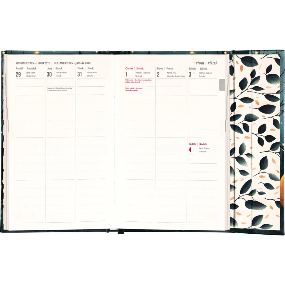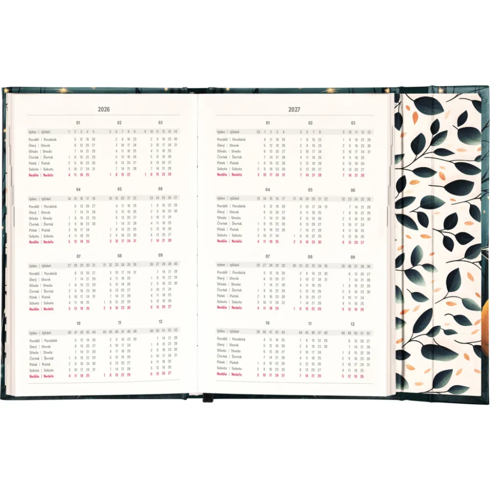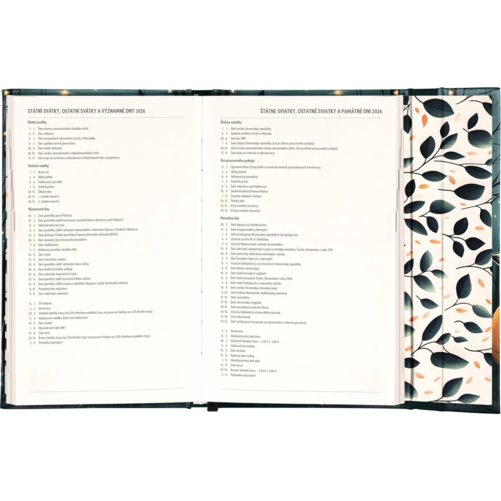 Týdenní diář s praktickým magnetickým uzavíráním je ideální volbou pro ty, kteří chtějí mít své plány přehledně pod kontrolou. Nabízí sloupcové rozvržení jednotlivých týdnů s dostatkem prostoru pro každodenní poznámky. Součástí jsou praktické měsíční přehledy, ideální pro plánování dovolených či prázdnin, a také seznam českých a slovenských svátků a jmenin.