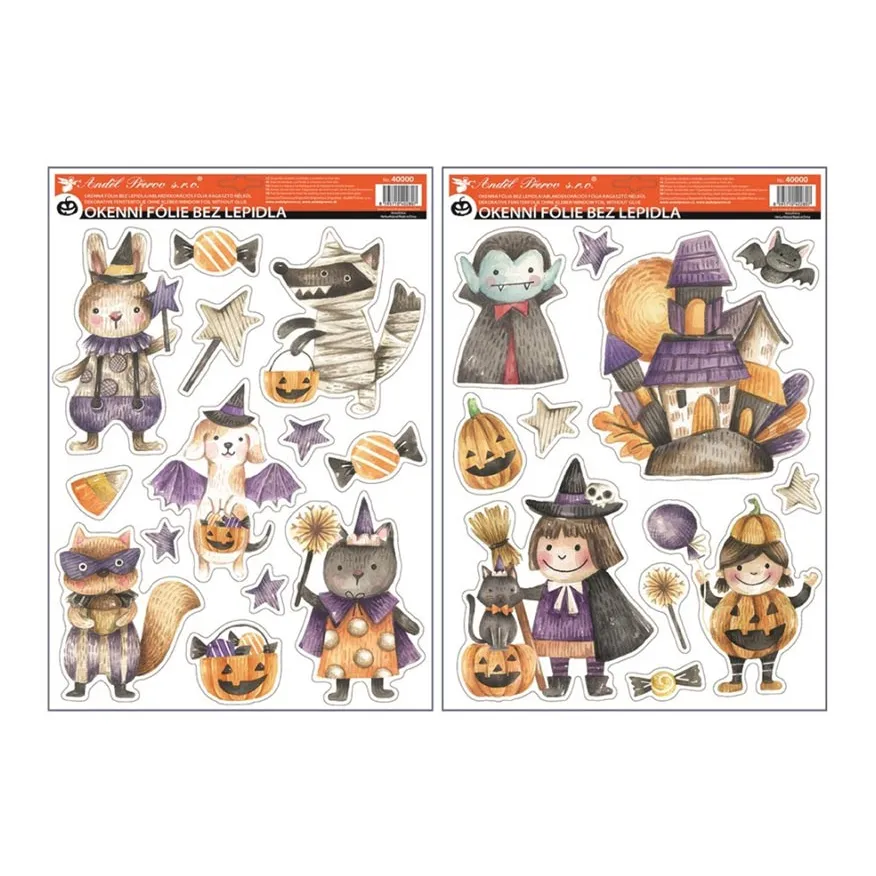 Dekorační okenní fólie čarodějky s glitrem. Tato samolepicí fólie s roztomilými postavičkami čarodějnic, upírů a zvířátek v kostýmech, doplněná o tradiční halloweenské motivy, je perfektní dekorací pro oživení vašich oken či jiných hladkých povrchů. Díky třpytivým detailům září a přitahují pozornost. Fólie je snadno použitelná, bez potřeby lepidla, a lze ji jednoduše aplikovat i odstranit, bez zanechání stop, a je opakovaně použitelná. Ideální volba pro vytvoření zábavné a strašidelné halloweenské výzdoby!