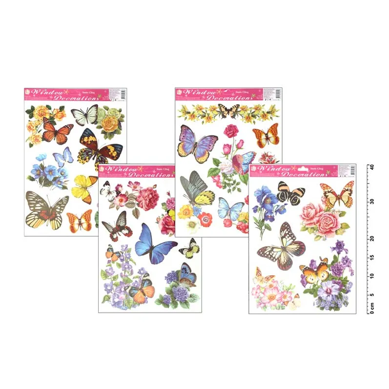Dekorační okenní fólie motýli a květy. Okenní fólie neobsahují lepidlo. Na plochu přilnou elektrostaticky a nezanechávají tedy po sobě žádnou stopu. Vhodné jsou jakékoli hladké plochy, například sklo, výlohy, zrcadla nebo kachličky. Čisté, bez lepidla a opakovaně použitelné.