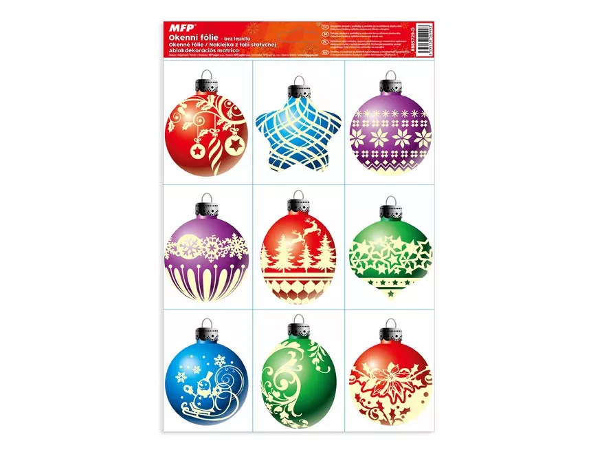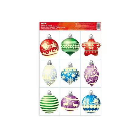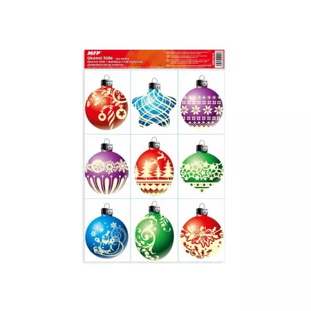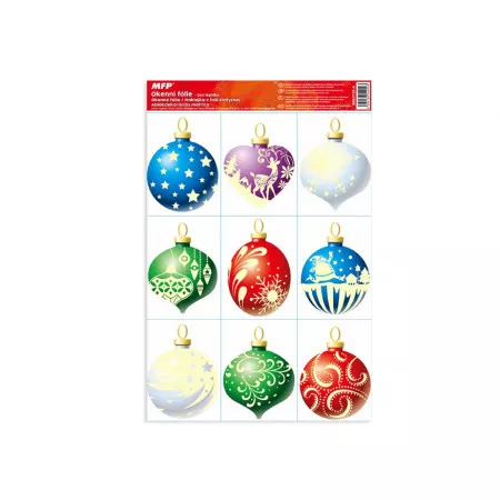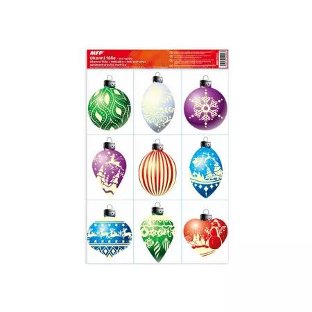 Okenní fólie MFP vánoce glitr VA009 20x30cm. Okenní fólie s vánočním motivem vánočních ozdob. Fólie neobsahuje lepidlo, jednoduše elektrostaticky přilne na čistém okně, zrcadle apod. Tato dekorace je balena v sáčku se závěsem. Cena za 1 kus, dodáváme v mixu motivů.