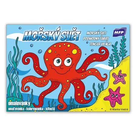 Omalovánky MFP Mořský svět. Dětské omalovánky s osmy obrázky mořských zvířátek. Omalovánky jsou jednoduché, s velkými obrázky, tudíž vhodné i pro ty nejmenší děti. Vybarvování obrázků pomáhá rozvíjet řadu schopností a dovedností, zejména má velký vliv na jemnou motoriku ruky. Ilustrovala Blanka Vostrá, formát omalovánek A5. Nevhodné pro děti do 3 let, nebezpečí vdechnutí a spolknutí malých částic.