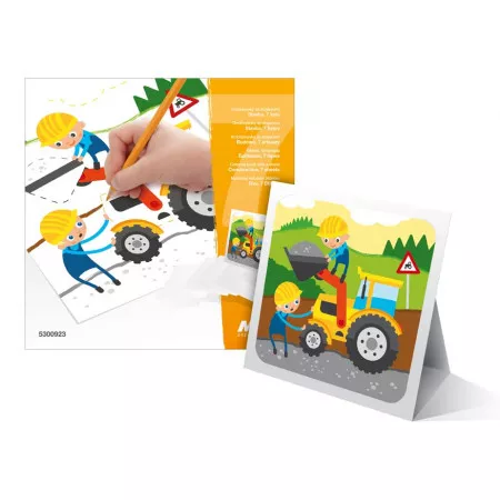 Omalovánky se stojánkem Stavba 7 listů 18x18cm. Omalovánky - 7 karet (o rozměru 18x18cm) na vymalování a skládací stojánek, do kterého lze obrázek vložit a vystavit.