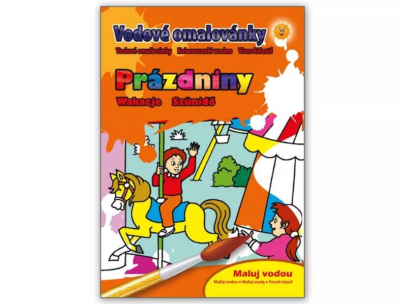 Omalovánky vodové MFP Prázdniny 205x290 16s. Vodové omalovánky s 16 obrázky zážitků z prázdnin. K těmto omalovánkám nepotřebujete barvy, stačí vzít štětec, namočit ho do vody a postupně přetírat jednotlivé barvy obrázků. Děti a stůl tak zůstanou krásně čisté.