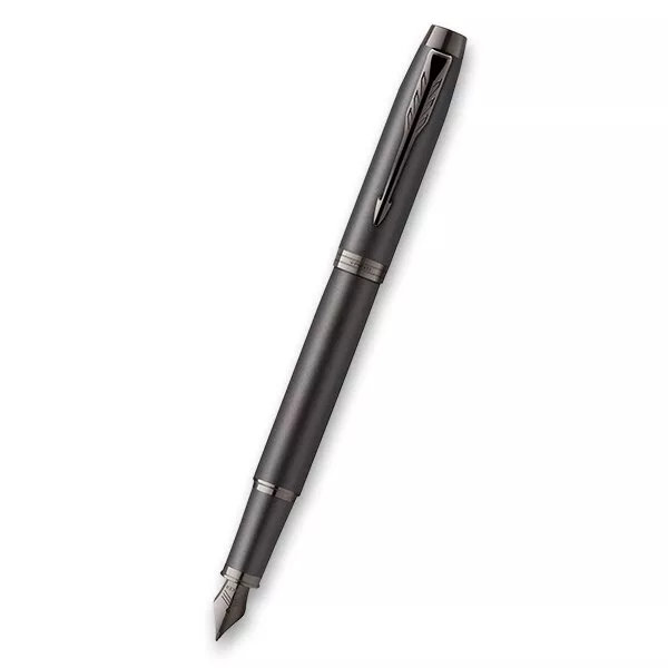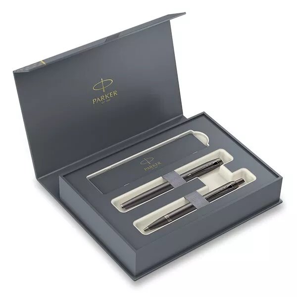 Sada plnicí pero a kuličkové pero Parker IM Monochrome Titanium v dárkové kazetě. Tělo a víčko z mosazi pokryté matným tmavým lakem. V kombinaci s doplňky potaženými pomocí techniky PVD odolnou lesklou tmavou barvou. Hrot z nerezové oceli se zdobnou jemnou rytinou, potažený odolnou vrstvou v tmavé barvě.