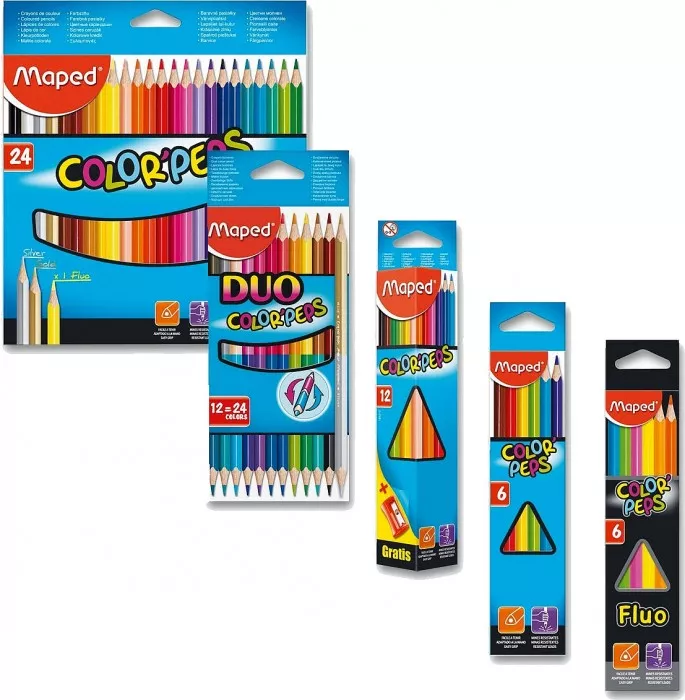 Pastelky Maped Color'Peps trojhranné - různé varianty. Trojhranné pastelky jsou provedeny ve veselém designu. Maped pastelky mají trojhranné, ergonomické tělo a odolnou měkkou tuhu v jasných barvách.