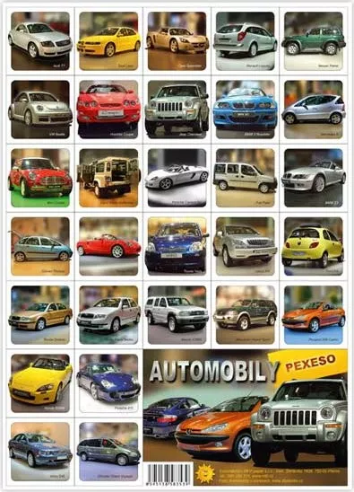 Pexeso MFP Automobily. Populární dětská stolní hra, pexeso pro malé děti s obrázky aut. Tato karetní hra obsahuje 32 dvojic obrázků. Hrací kartičky jsou o velikosti 4x4cm. Výborná učební pomůcka pro děti a rodiče. Naučte své děti poznávat druhy aut a procvičujte jejich paměť. Věděli jste, že slovo PEXESO vzniklo souslovím slov PEKELNĚ SE SOUSTŘEĎ?