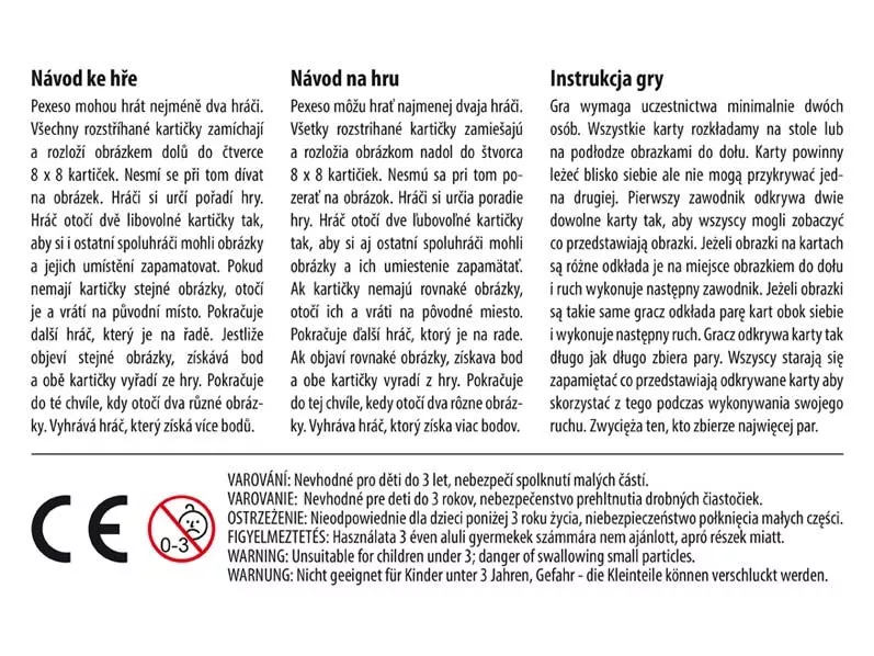 Návod ke hře pexeso: Pexeso mohou hrát nejméně dva hráči. Všechny rozstříhané kartičky se zamíchají a rozloží obrázkem dolů do čtverce 8x8 kartiček. Nesmí se při tom dívat na obrázek. Hráči si určí pořadí hry. Hráč otočí dvě libovolné kartičky tak, aby si i ostatní spoluhráči mohli obrázky a jejich umístění zapamatovat. Pokud nemají kartičky stejné obrázky, otočí je a vrátí na původní místo. Pokračuje další hráč, který je na řadě. Jestliže objeví stejné obrázky, získává bod a obě kartičky vyřadí ze hry. Pokračuje do té chvíle, kdy otočí dva různé obrázky. Vyhrává hráč, který získá více bodů. Nevhodné pro děti do 3 let, nebezpečí vdechnutí a spolknutí malých částic.