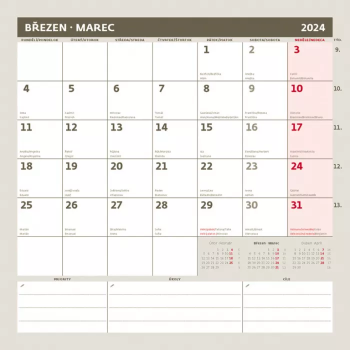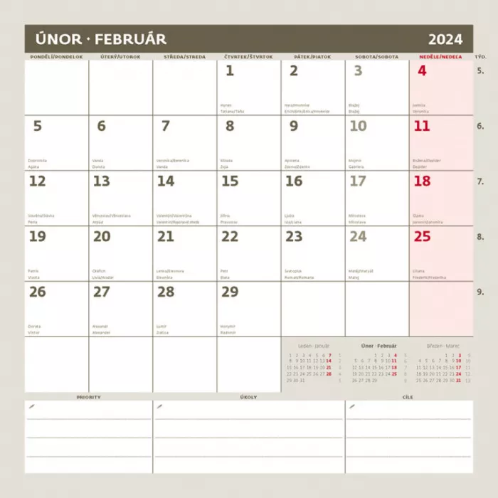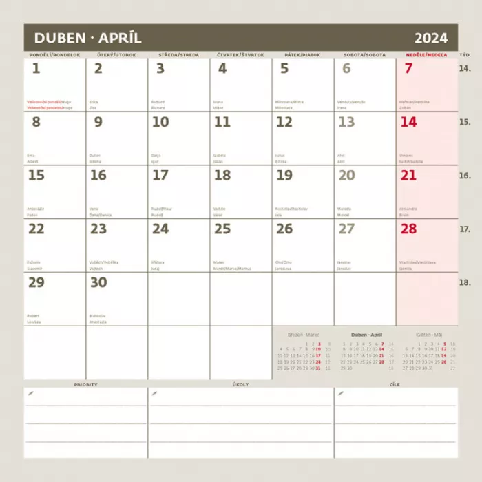 Formát kalendáře: 30 x 30 cm (30 x 60 cm) 14 listů + samolepky 12 fotografií s měsíčním kalendáriem Kalendárium: české a slovenské měsíční jmenné Vazba: Twin-wire (se spirálou) Super tuhá lepenka Více než 300 barevných samolepek Prostor pro přítisk: 30 x 7 cmFormát kalendáře: 30 x 30 cm (30 x 60 cm) 14 listů + samolepky 12 fotografií s měsíčním kalendáriem Kalendárium: české a slovenské měsíční jmenné Vazba: Twin-wire (se spirálou) Super tuhá lepenka Více než 300 barevných samolepek Prostor pro přítisk: 30 x 7 cm Vlastnosti kalendáře: Plánovací kalendář