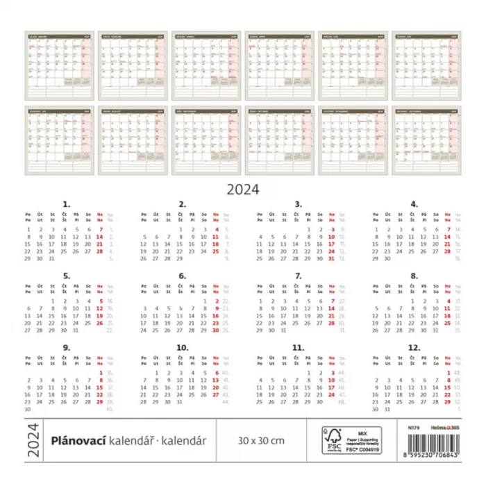 Plánovací kalendář (N179-24). Formát kalendáře: 30 x 30 cm (30 x 60 cm). 14 listů + samolepky. 12 fotografií s měsíčním kalendáriem. Kalendárium: české a slovenské měsíční jmenné.