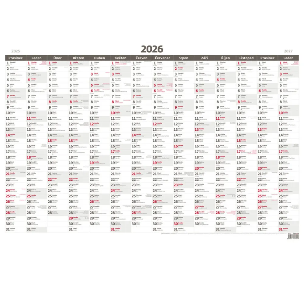 Formát kalendáře: 88 x 64 cm Kalendárium: české roční jmenné Rozsah: 1 list Prostor pro přítisk: 88 x 7 cmFormát kalendáře: 88 x 64 cm Kalendárium: české roční jmenné Rozsah: 1 list Prostor pro přítisk: 88 x 7 cm