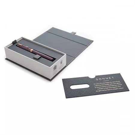 Plnicí pero 18K Parker Sonnet Purple Chiselled PGT, hrot M. Tělo a víčko z mincovního stříbra (ryzost Ag 925/1000) pokryté perleťově fialovým lakem, zdobný vzor vytvořený leptáním. V kombinaci s doplňky pokovenými růžovým zlatem. Hrot z 18karátového zlata (ryzost Au 750/1000) s křížovou rytinou pokovený růžovým zlatem.