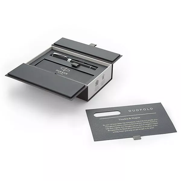 Plnicí pero Parker Duofold Classic Black CT INT, hrot F. Tělo a víčko z houževnaté, sametově černé pryskyřice. V kombinaci s doplňky pokovenými palladiem. Včetně individuálního sériového čísla. Hrot z 18karátového zlata se zdobnou rytinou, částečně pokovený rhodiem.