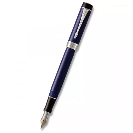 Plnicí pero Parker Duofold Classic Blue & Black CT CNT, hrot M. Tělo a víčko z houževnaté, temně modré pryskyřice. V kombinaci s doplňky pokovenými palladiem. Včetně individuálního sériového čísla. Hrot z 18karátového zlata se zdobnou rytinou, částečně pokovený rhodiem.
