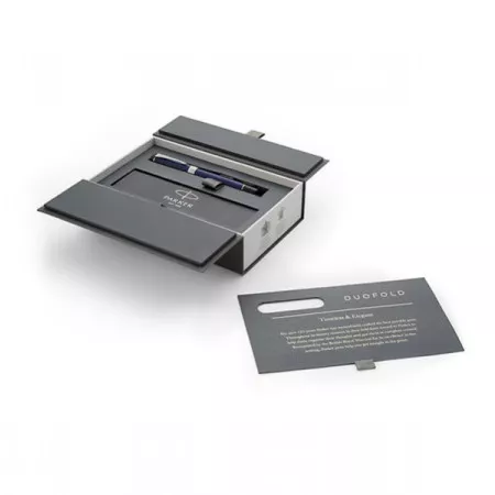 Plnicí pero Parker Duofold Classic Blue & Black CT INT, hrot F. Tělo a víčko z houževnaté, temně modré pryskyřice. V kombinaci s doplňky pokovenými palladiem. Včetně individuálního sériového čísla. Hrot z 18karátového zlata se zdobnou rytinou, částečně pokovený rhodiem.