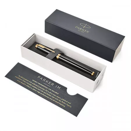 Plnicí pero Parker IM Black GT, hrot M. Mosazné tělo a víčko s lesklou povrchovou úpravou. V kombinaci s doplňky pokovenými zlatem, s leštěnou úpravou. Hrot z ušlechtilé nerezové oceli.
