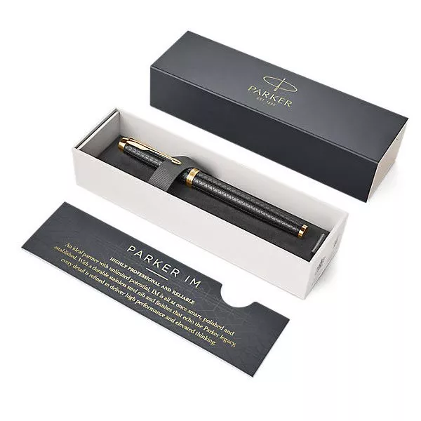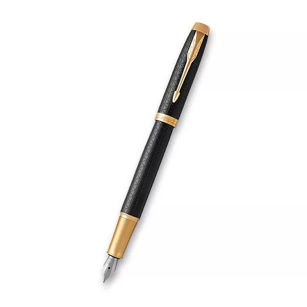 Plnicí pero Parker IM Premium Black GT, hrot M. Tělo a víčko z eloxovaného hliníku se zdobnou rytinou vytvořenou pomocí laseru, povrch ošetřen pískováním. V kombinaci s doplňky pokovenými zlatem, s leštěnou úpravou. Hrot z ušlechtilé nerezové oceli.