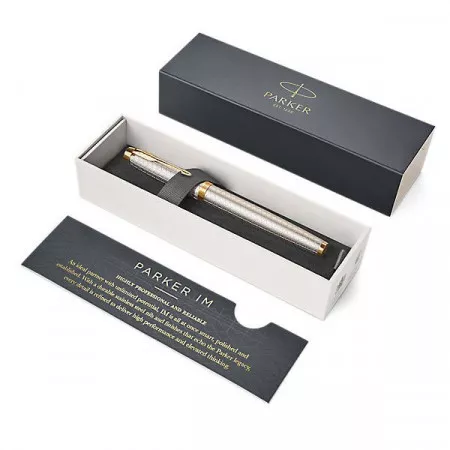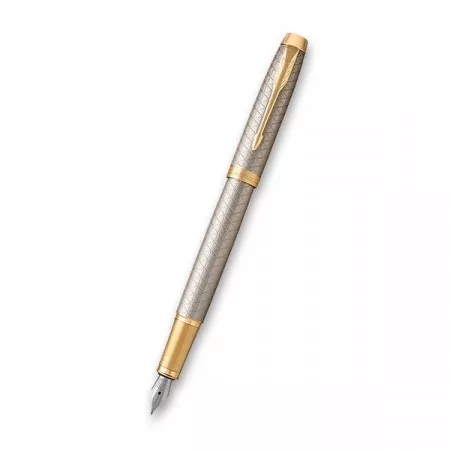 Plnicí pero Parker IM Premium Warm Grey GT, hrot F. Tělo a víčko z eloxovaného hliníku se zdobnou rytinou vyvedenou pomocí laseru, povrch ošetřen pískováním. V kombinaci s doplňky pokovenými zlatem, s leštěnou úpravou. Hrot z ušlechtilé nerezové oceli.