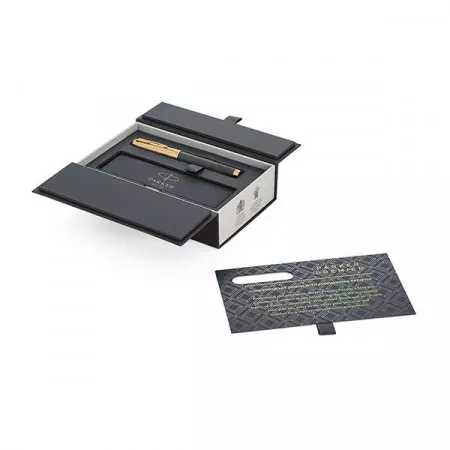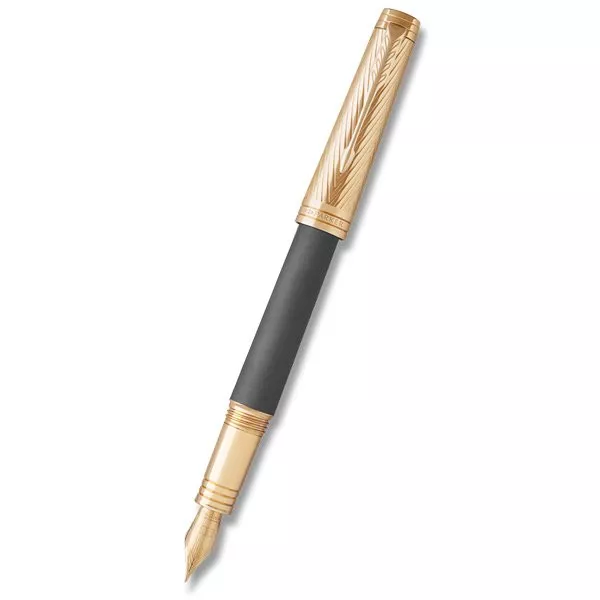Plnicí pero Parker Premier Custom Storm Grey GT, hrot M. Mosazné tělo pokryté šedým lakem, doplněné mosazným víčkem se zdobným vzorem vytvořeným leptáním a pokoveným 23karátovým zlatem. V kombinaci s doplňky pokovenými 23karátovým zlatem. Hrot z 18karátového zlata (ryzost Au 750/1000).