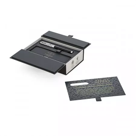 Plnicí pero Parker Premier Custom Tartan Lacquer & Metal CT, hrot M. Mosazné tělo pokryté temně černým lakem, doplněné mosazným víčkem zdobeným tartanovým vzorem a pokoveným palladiem. V kombinaci s doplňky pokovenými palladiem. Hrot z 18karátového zlata (ryzost Au 750/1000) zcela pokovený rhodiem.