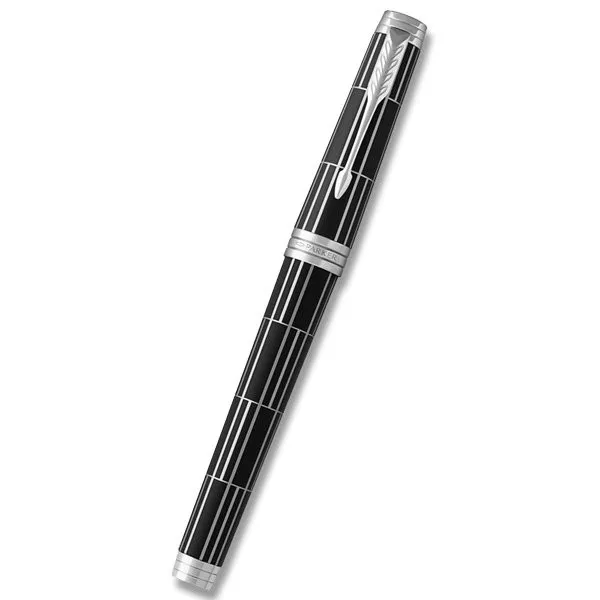 Plnicí pero Parker Premier Luxury Black CT, hrot F. Mosazné tělo a víčko pokryté temně černým lakem s efektem připomínajícím pryž, zdobný vzor vytvořený leptáním. V kombinaci s doplňky pokovenými palladiem. Hrot z 18karátového zlata (ryzost Au 750/1000) zcela pokovený rhodiem.