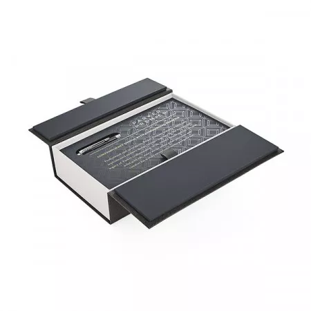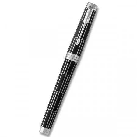 Plnicí pero Parker Premier Luxury Black CT, hrot M. Mosazné tělo a víčko pokryté temně černým lakem s efektem připomínajícím pryž, zdobný vzor vytvořený leptáním. V kombinaci s doplňky pokovenými palladiem. Hrot z 18karátového zlata (ryzost Au 750/1000) zcela pokoveným rhodiem.