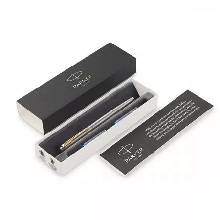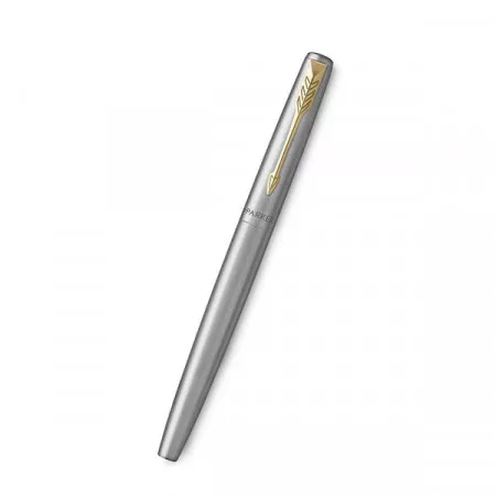 Plnicí pero Parker Royal Jotter Stainless Steel GT, hrot M. Tělo a víčko z broušené nerezové oceli. V kombinaci s klipem pokoveným zlatem, s leštěnou úpravou.