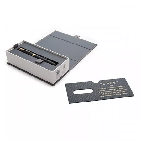 Plnicí pero Parker Sonnet Black GT, hrot F. Černě lakované tělo a víčko. V kombinaci s doplňky pokovenými zlatem. Hrot z nerezové oceli s křížovou rytinou, pokovený zlatem.